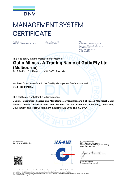GATIC's products are manufactured in accordance with Australian Standard AS3996. We have a quality management system that complies with ISO9001:2015.